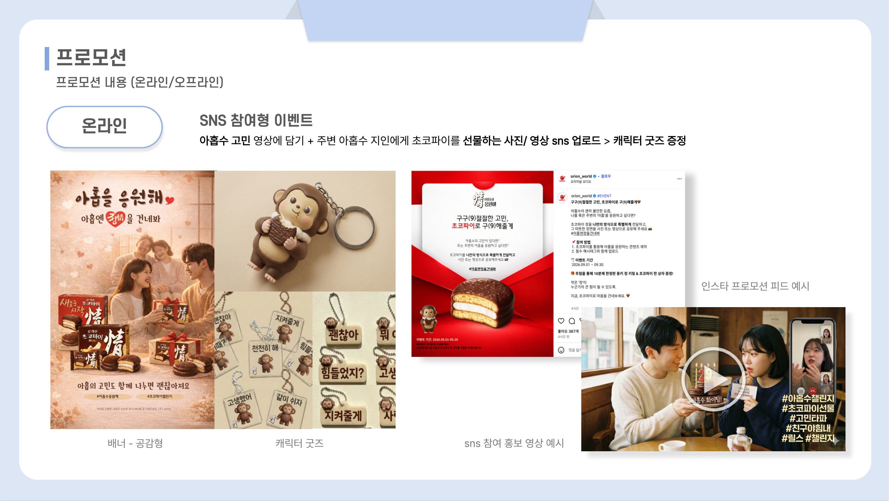 - 소구점 1. 감성 소구 오리온은 경쟁사와의 품질 차별화가 어려운 상황에서 제품 자체의 효용보다 브랜드 이미지와 심리적 가치를 강조하는 전략을 선택했다